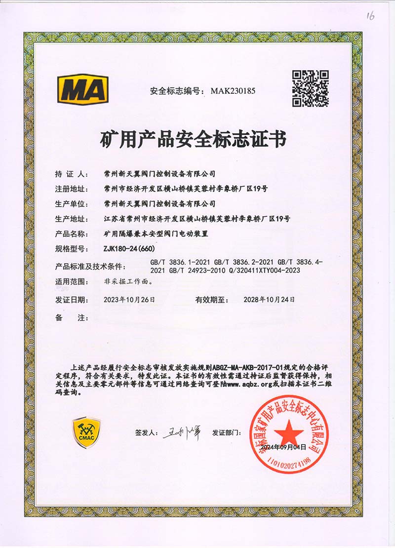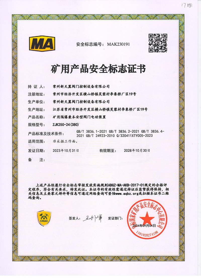礦用產品安全標志證書ZJK180-24(380)