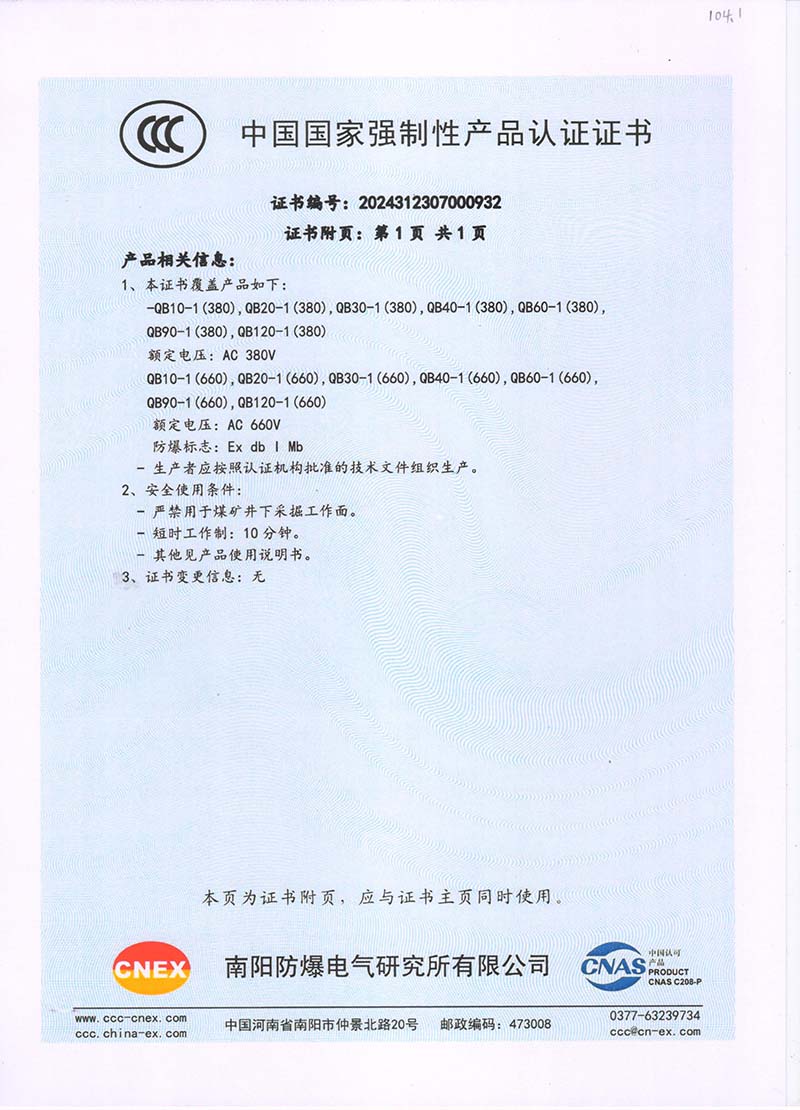 礦用隔爆QB(380V 660V) 國家強制性產品認證證書104.1